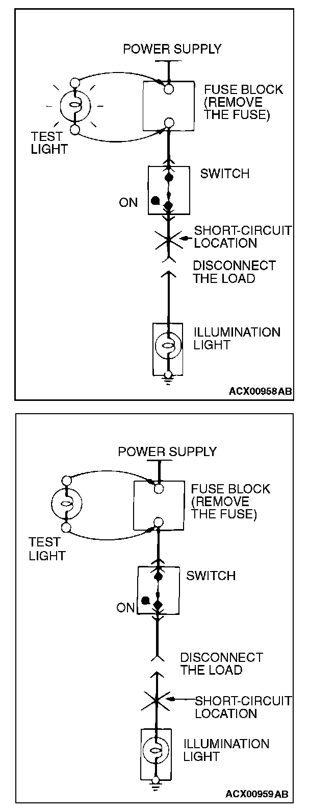 STEP 1. Remove the blown fuse and connect the test light across the fuse terminals (Circuit switch: OFF).