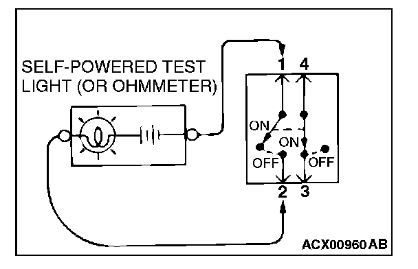 2 When the switch is the "ON" position and the contact points of terminals 3 and 4 are connected, the self-powered test light should come on or the ohmmeter should read 0 ohm.