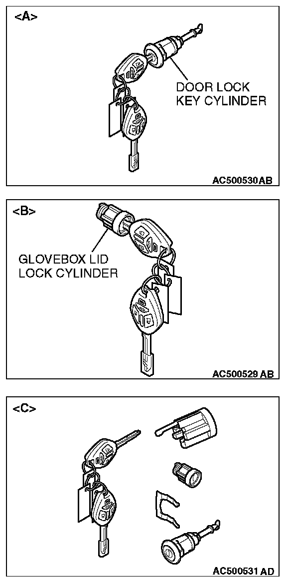 - Do not register the ignition keys other than the ignition key that starts the engine. (When replacing by the door lock key cylinder of illustration [A] or the glove box lid lock cylinder of illustration [B], the engine cannot start if the encrypted code is registered with the bar code on the ignition key supplied simultaneously. If the ignition key using for each lock cylinder and starting engine is used as a common ignition key, replace by the key set of illustration [C].)