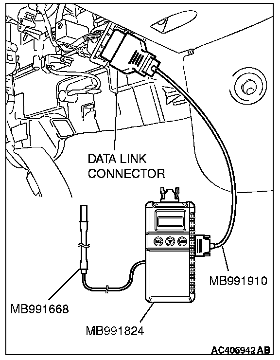 1. After the ignition switch is in "LOCK" (OFF) position, connect scan tool MB991958 to the data link connector.