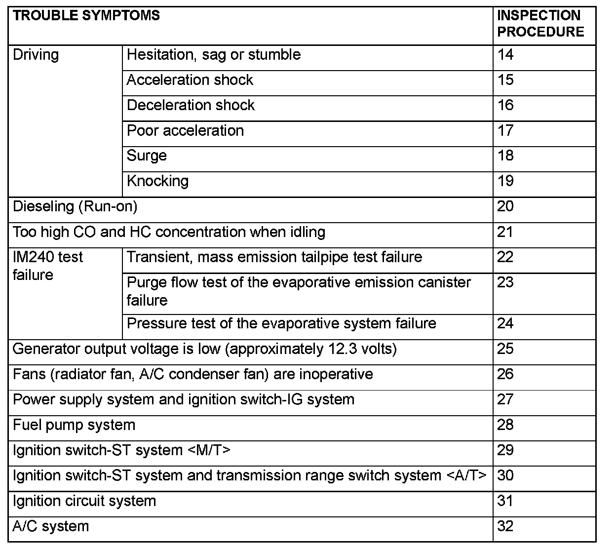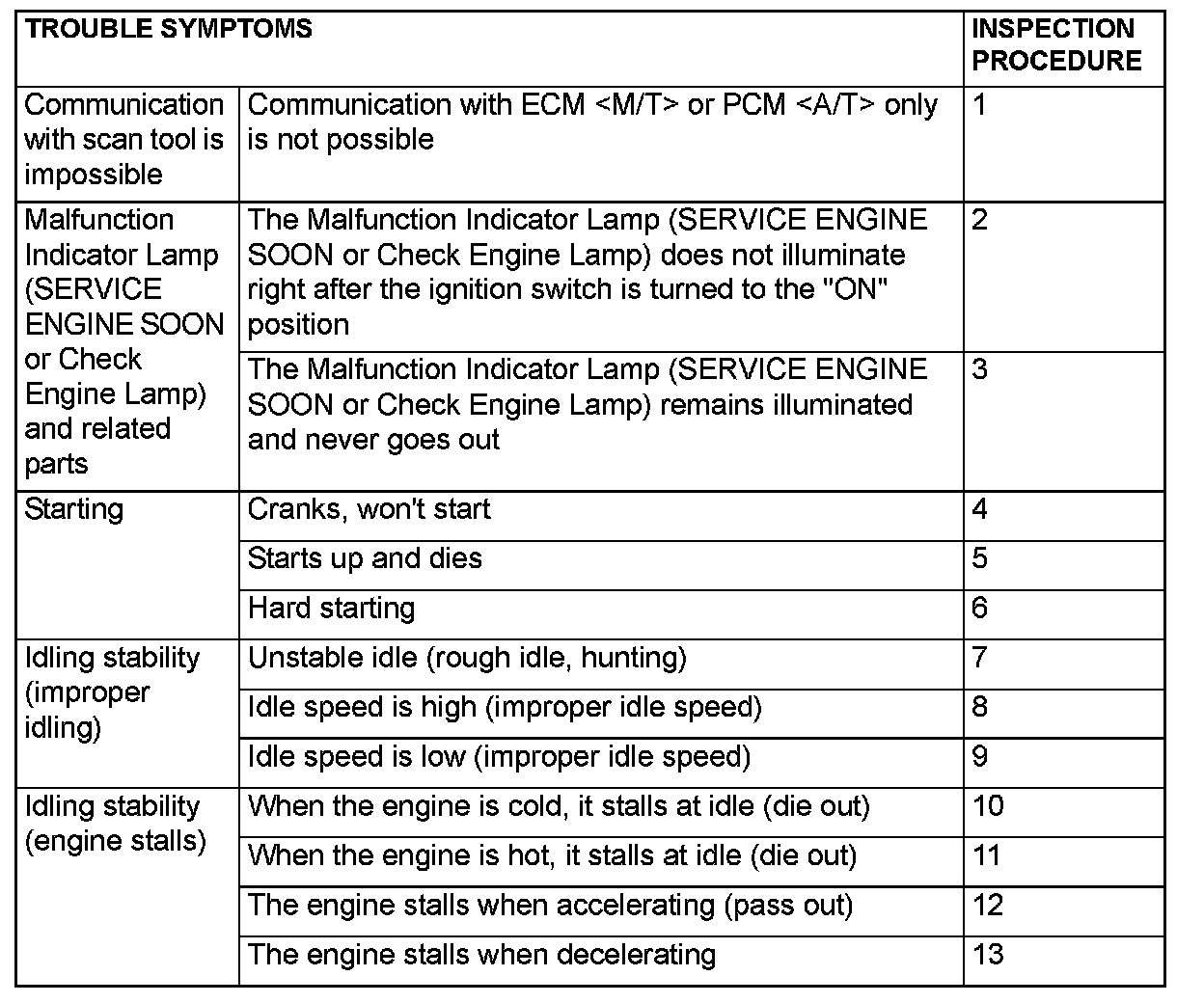 - Check that the ECM [M/T] or the PCM [A/T] ground circuit is normal before checking for the cause of the problem.