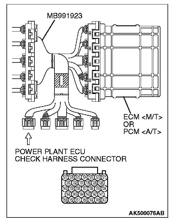 1. Disconnect all ECM [M/T] connectors or PCM [A/T] connectors. Connect the check harness special tool (MB991923) between the separated connectors.