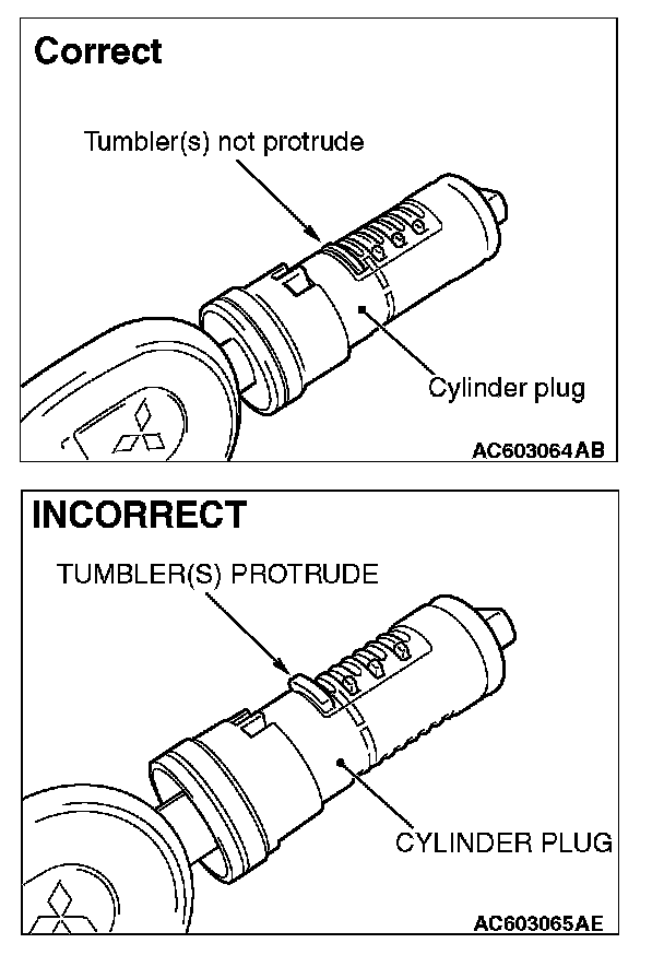 4. When the tumbler is not protruding, the correct tumbler is selected. Otherwise, the wrong tumbler is selected.If the wrong tumbler has been selected, remove the tumbler No. 1, and set the tumbler in the order from No. 2 to 4. Then, check the key insertion state and select the tumbler which does not protrude from the cylinder plug.