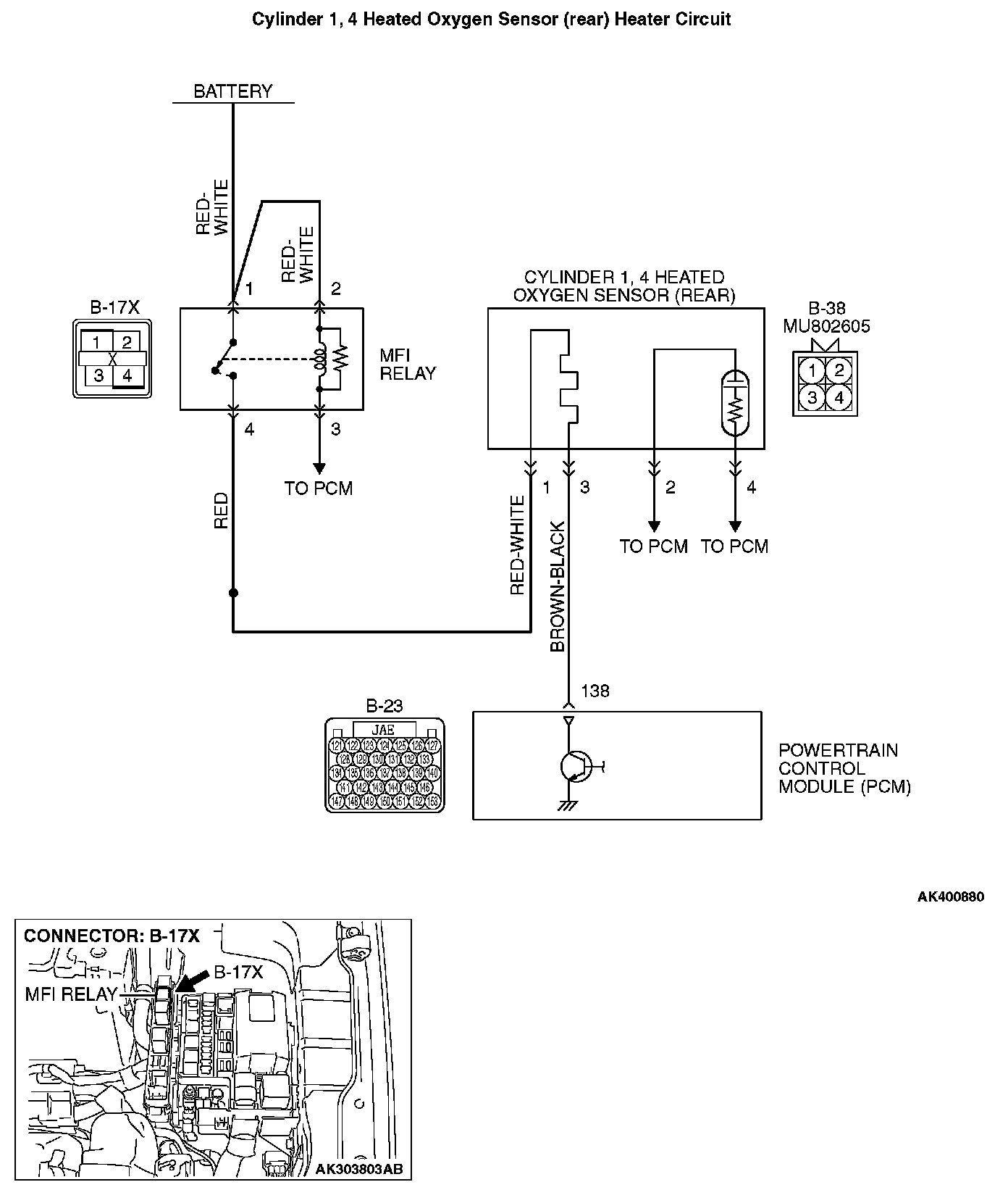 - Power is supplied from the MFI relay (terminal No. 4) to the cylinder 1, 4 heated oxygen sensor (rear) heater.