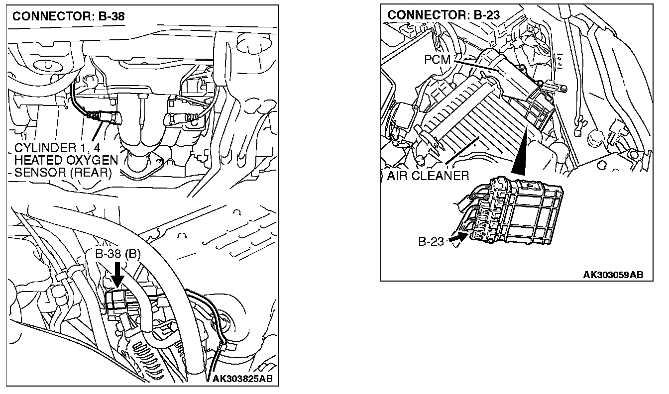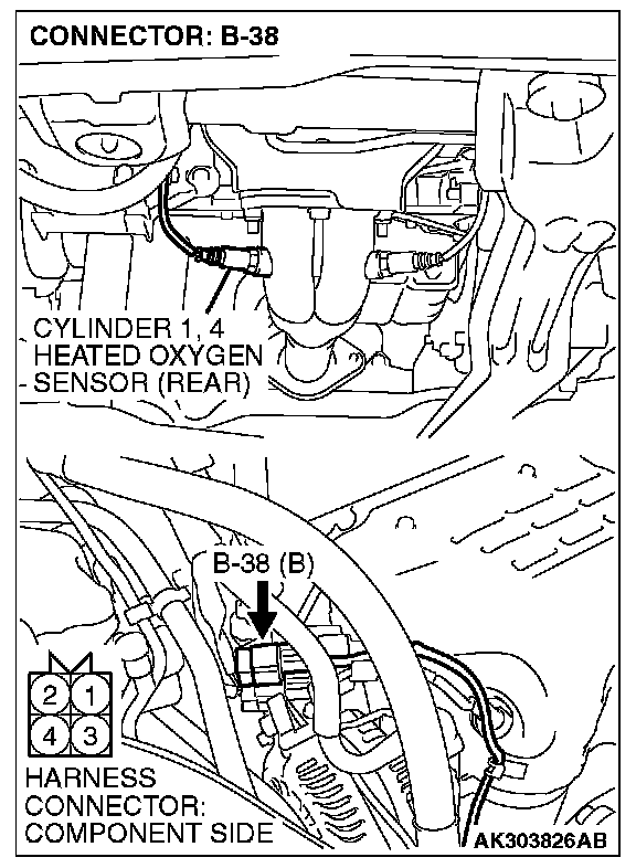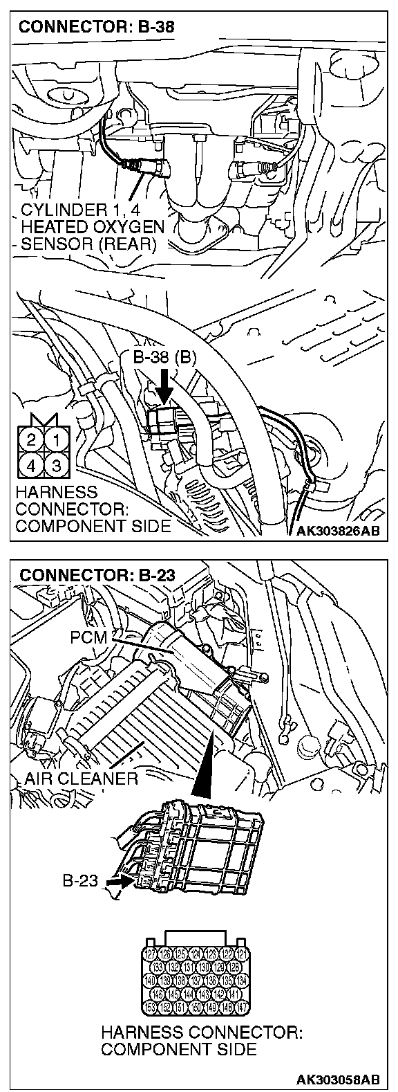 1. Disconnect cylinder 1, 4 heated oxygen sensor (rear) connector B-38 and connect test harness special tool, MD998464, to the connector on the cylinder 1, 4 heated oxygen sensor (rear) side.