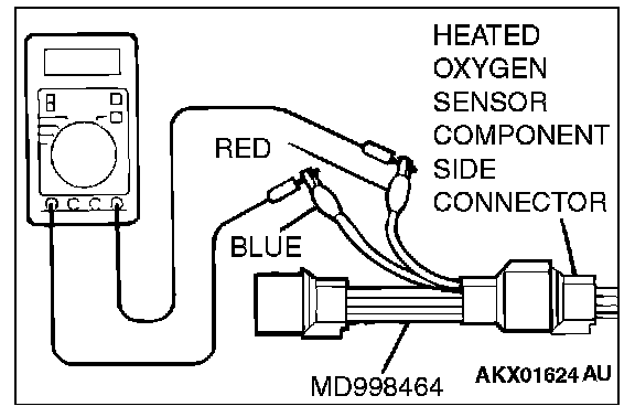 2. Measure the resistance between heated oxygen sensor connector terminal No. 1 (red clip) and terminal No. 3 (blue clip).