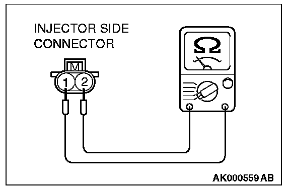 2. Measure the resistance between each injector side connector terminal No. 1 and No. 2.