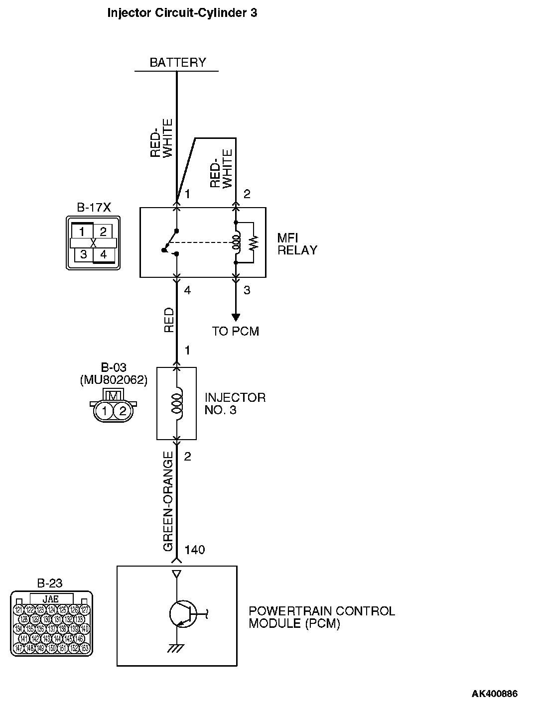 STEP 6. Check for harness damage between MFI relay connector B-17X (terminal No. 4) and No. 3 cylinder injector connector B-03 (terminal No. 1).