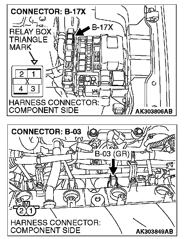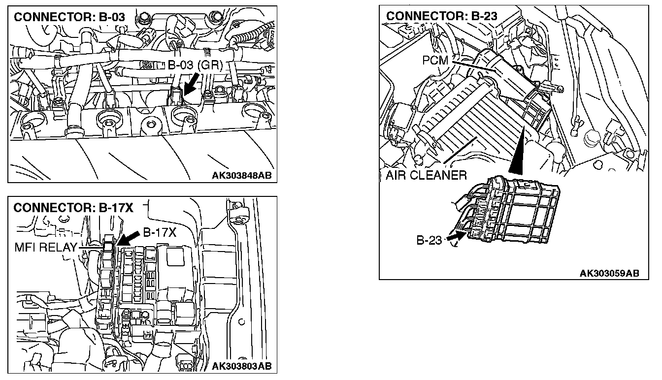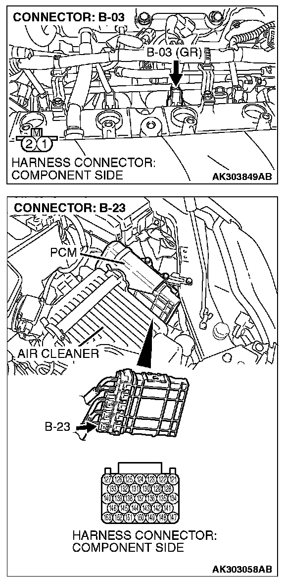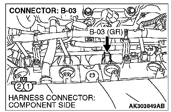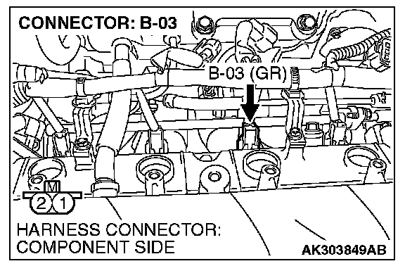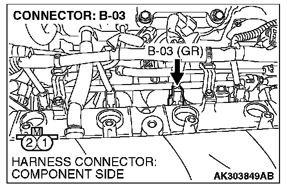1. Disconnect the injector No. 3 connector B-03 and connect the test harness special tool MB991658 between the separated connectors. (All terminals should be connected.)