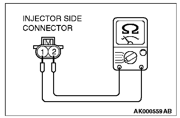 2. Measure the resistance between injector side connector terminal No. 1 and No. 2.