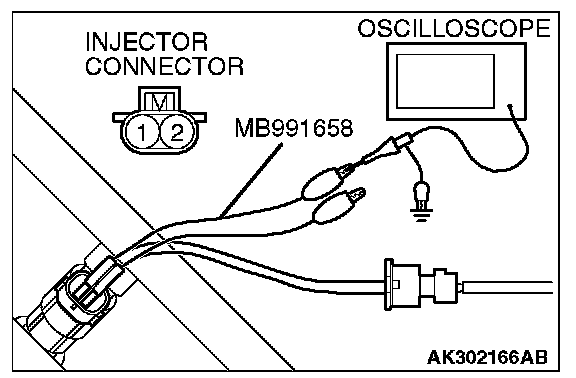 2. Connect the oscilloscope probe to the injector side connector terminal No. 2.