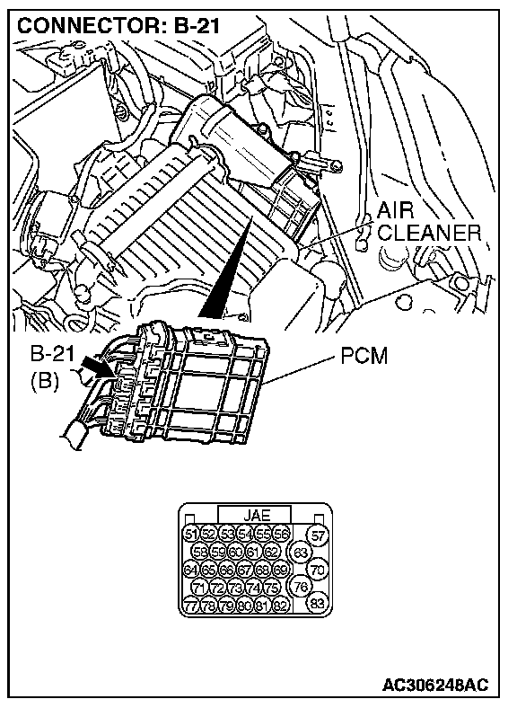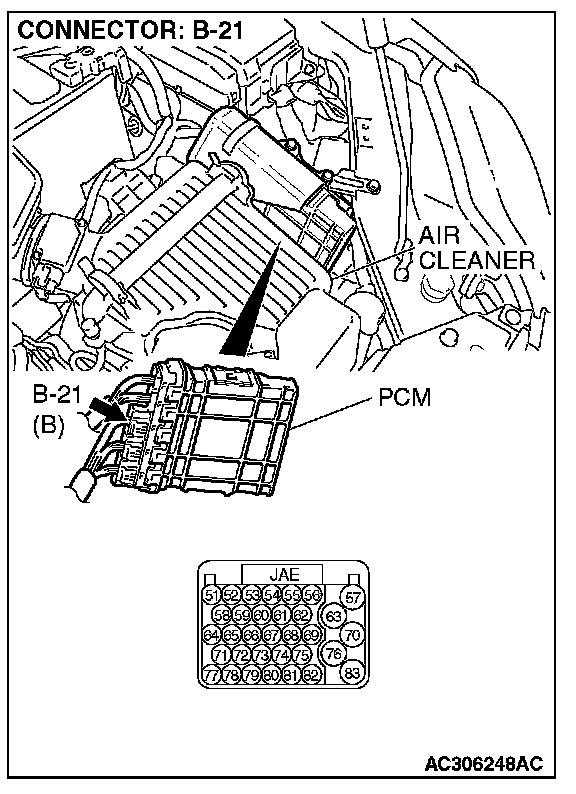 STEP 10. Check PCM, connector B-21 for loose, corroded or damaged terminals, or terminals pushed back in the connector.
