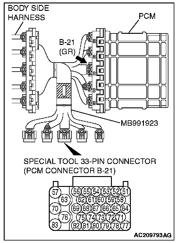 2) Connect special tool MB991923 (check harness) between the PCM, and the body-side harness connector.