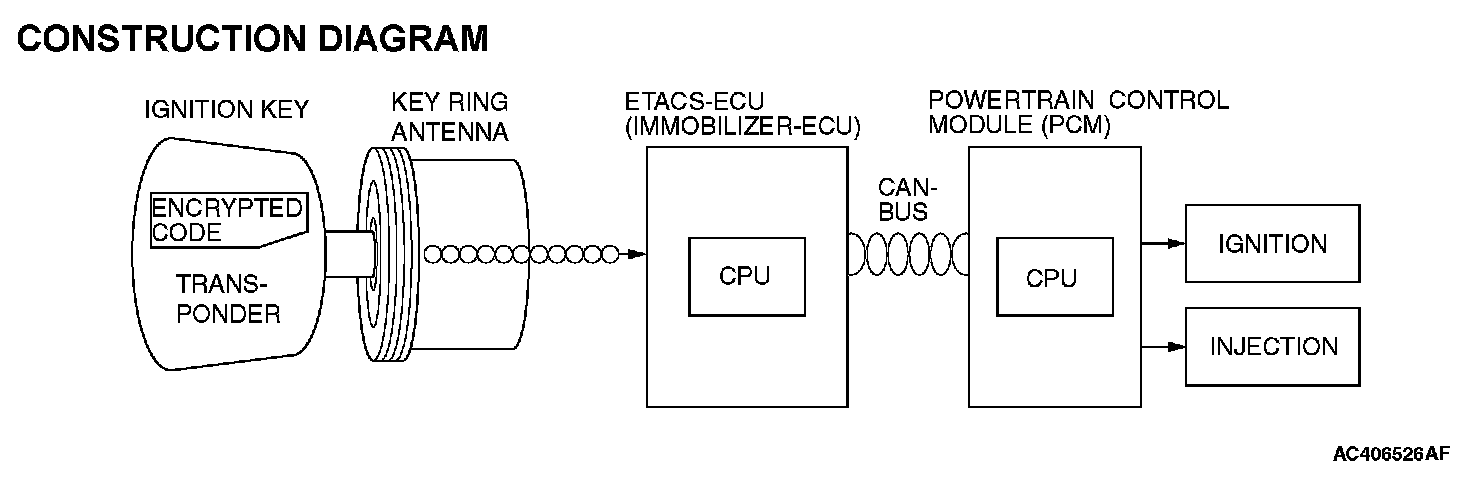 IMMOBILIZER SYSTEMThe engine immobilizer system consists of the ignition key, the key ring antenna, the ETACS-ECU (immobilizer-ECU), and the powertrain control module (PCM). It has these functions: