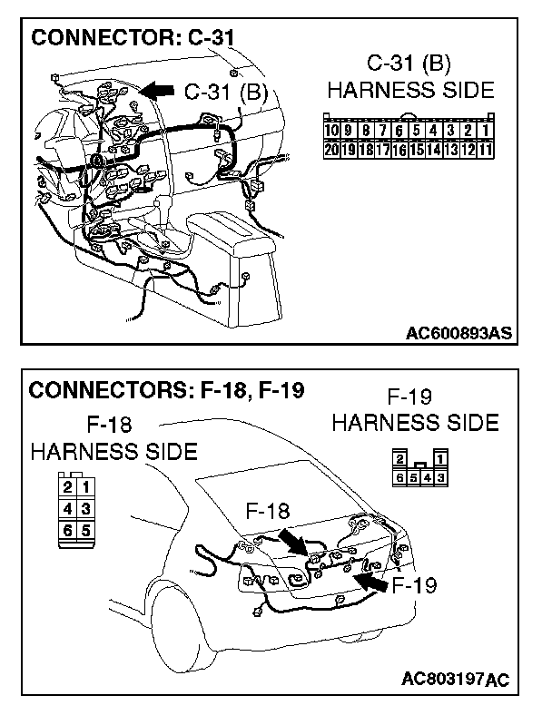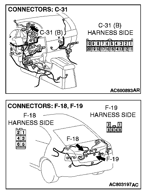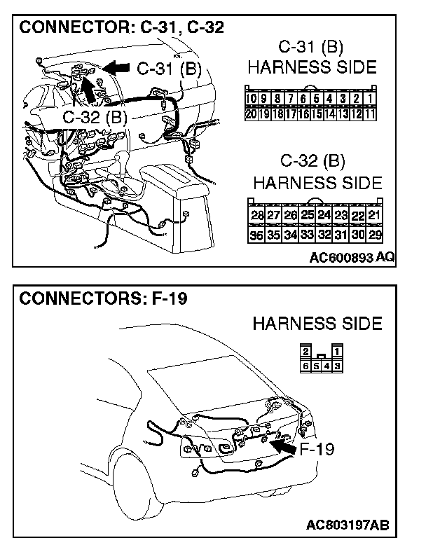 STEP 6. Check multi-center display connector C-31, C-32 and rear view camera connector F-19 for loose, corroded or damaged terminals, or terminals pushed back in the connector.