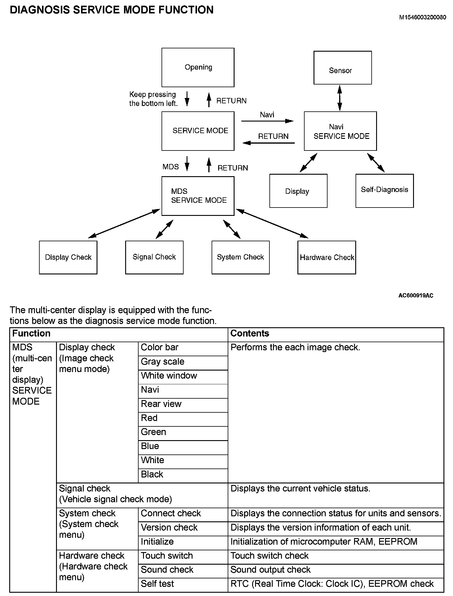 When "System Check" is touched on the MDS (multi-center display) service menu, the menu is switched to the System Check menu. From this menu, the switching to various check modes is performed.