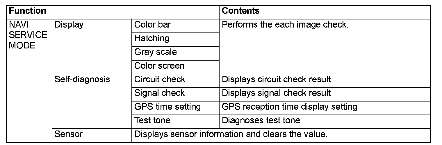 When "Self-Diagnosis" is touched on the Navi service menu, the screen is switched to the Self-Diagnosis menu. From this menu, the switching to the circuit check mode, signal check mode, GPS time setting mode, or test tone mode is performed. Also, when "Back" is touched on the check mode screens, the screen returns to the Self-Diagnosis menu.