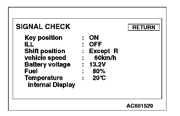 - Signal Check: Vehicle signal check mode (key position, ILL, shift position, vehicle speed, battery, fuel amount, internal temperature of multi-center display)
