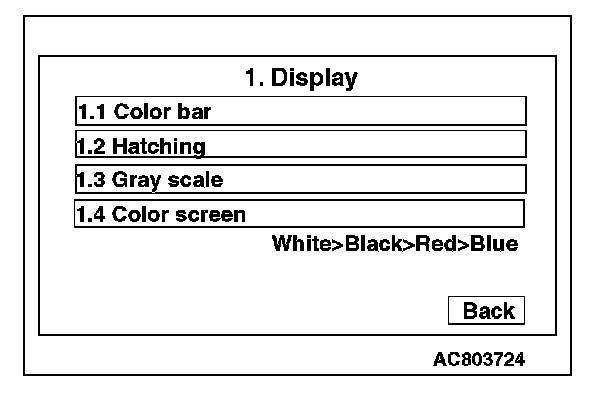 When "Display" is touched on the Navi service menu, the menu is switched to the Display menu. From this menu, the switching to various check modes is made. Also, when "Back" is touched on the image check mode screens, the screen returns to the Display menu.