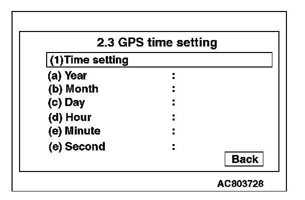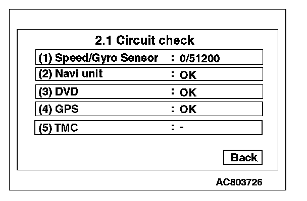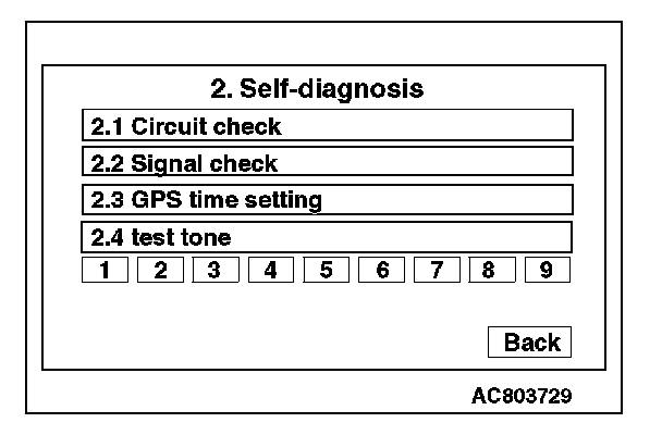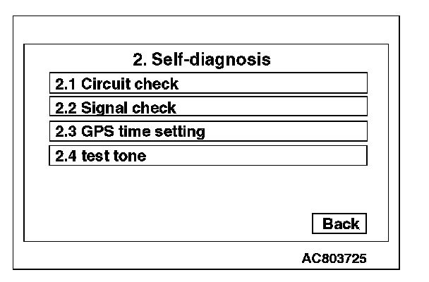 NOTE: When "Back" is touched on the Self-Diagnosis menu screen, the Self-Diagnosis menu ends, and the screen returns to the Navi service menu.