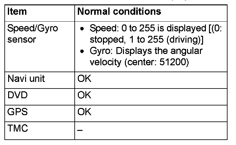 - When "circuit check" is touched, the vehicle speed, gyro angle speed, internal RAM status of navigation unit, DVD drive, or GPS antenna connection status is displayed.