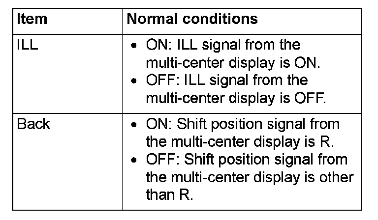 - "Shift position": Displays "R" when the position is in the R (reverse) position, "Except R" when the position is in other than the R (reverse) position, and "--" when the ignition key is OFF.