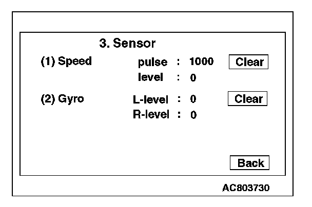- Sensor: Displays and clears the values of the speed sensor pulse, distance calibration level, and gyro calibration level (right and left).
