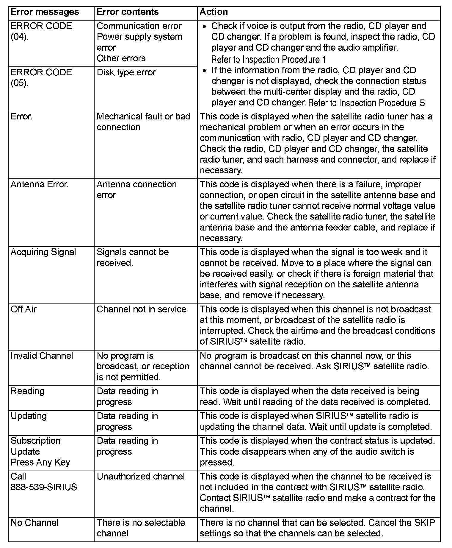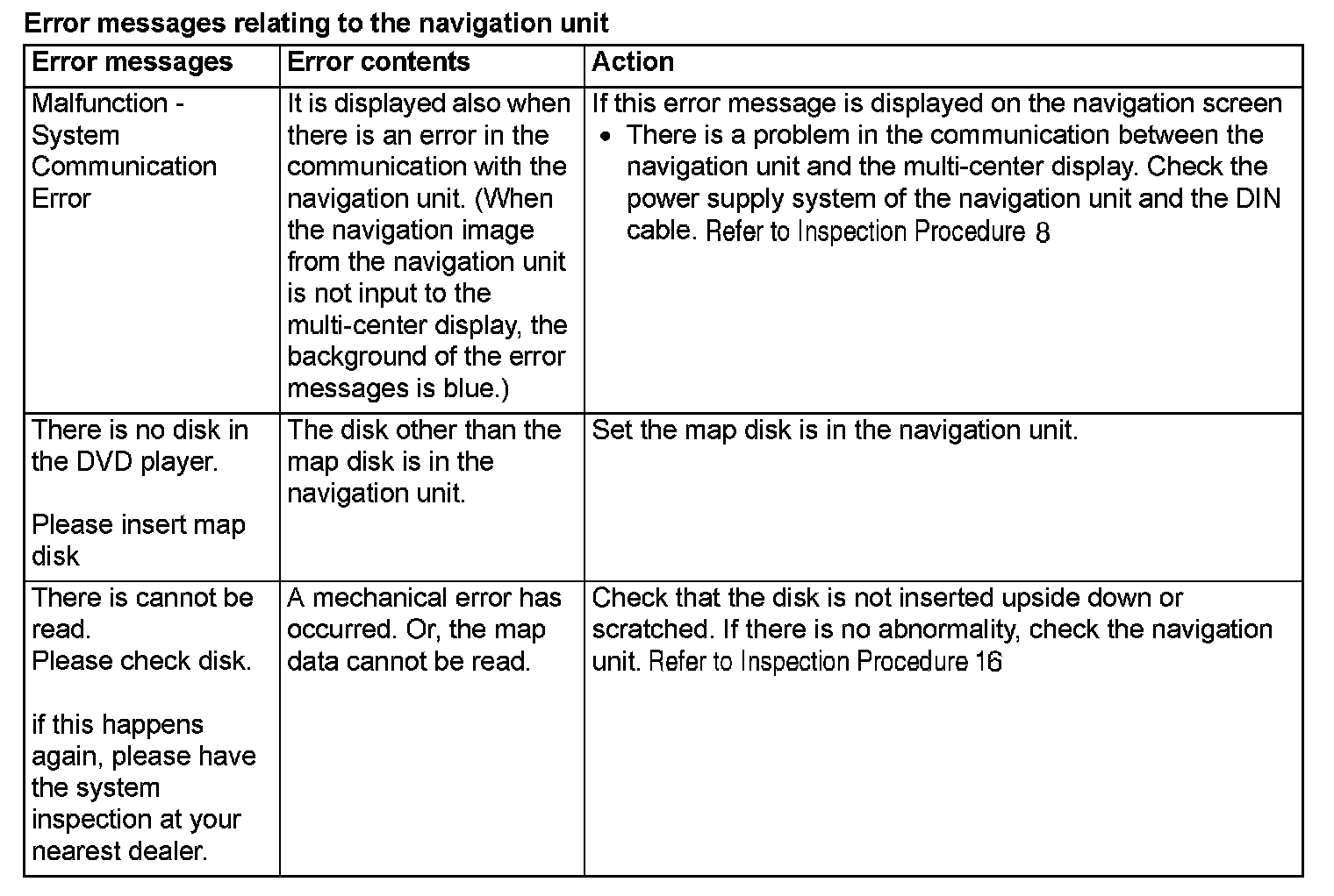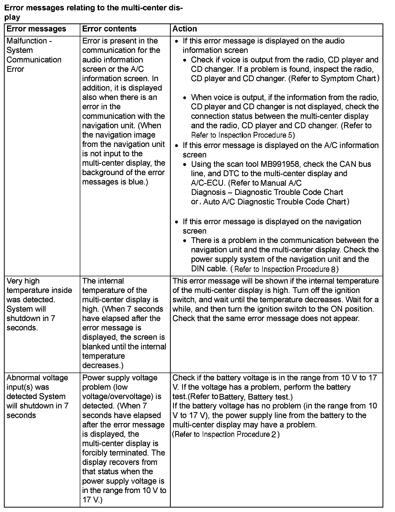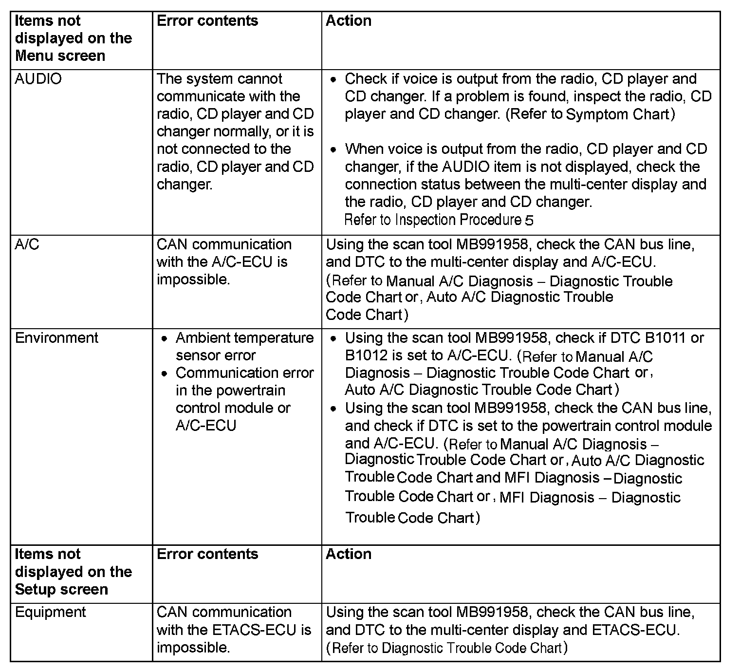 The multi-center display shows the error messages below if an abnormality is present in itself or communications. If the information of items on the menu/setup screen cannot be obtained, the items are not displayed.