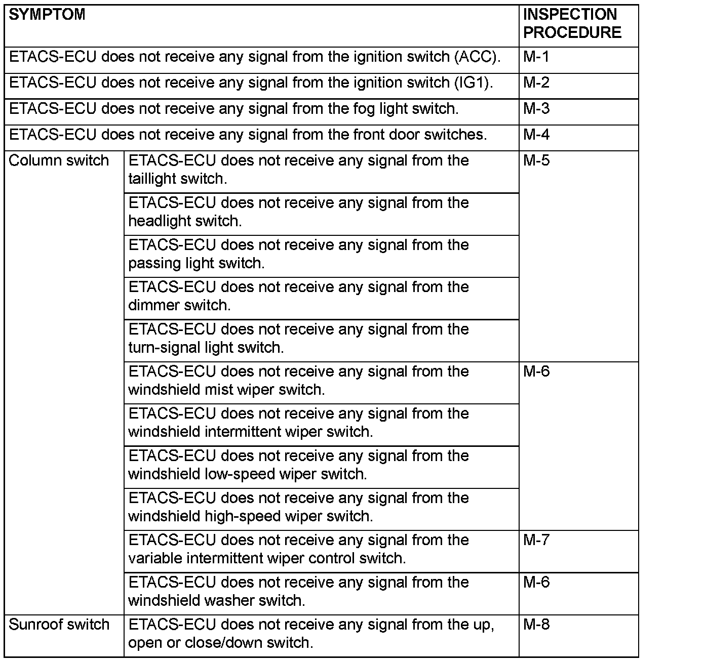 If a problem is found in the Data List inspection, observe the table below.