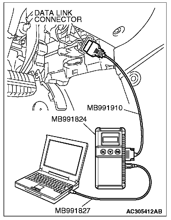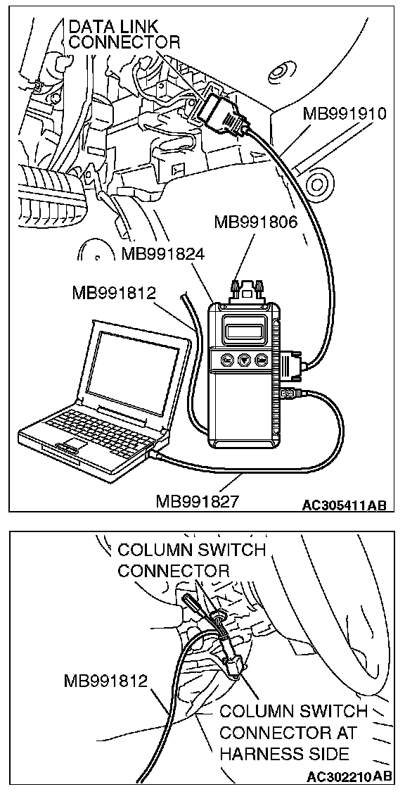CAUTION: To prevent damage to scan tool MB991958, always turn the ignition switch to the "LOCK" (OFF) position before connecting or disconnecting scan tool MB991958.