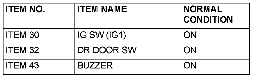 Normal condition is not displayed for "BUZZER" : Replace the ETACS-ECU. When the ETACS-ECU is replaced, register the encrypted code. The door-ajar tone alarm function should now work normally.
