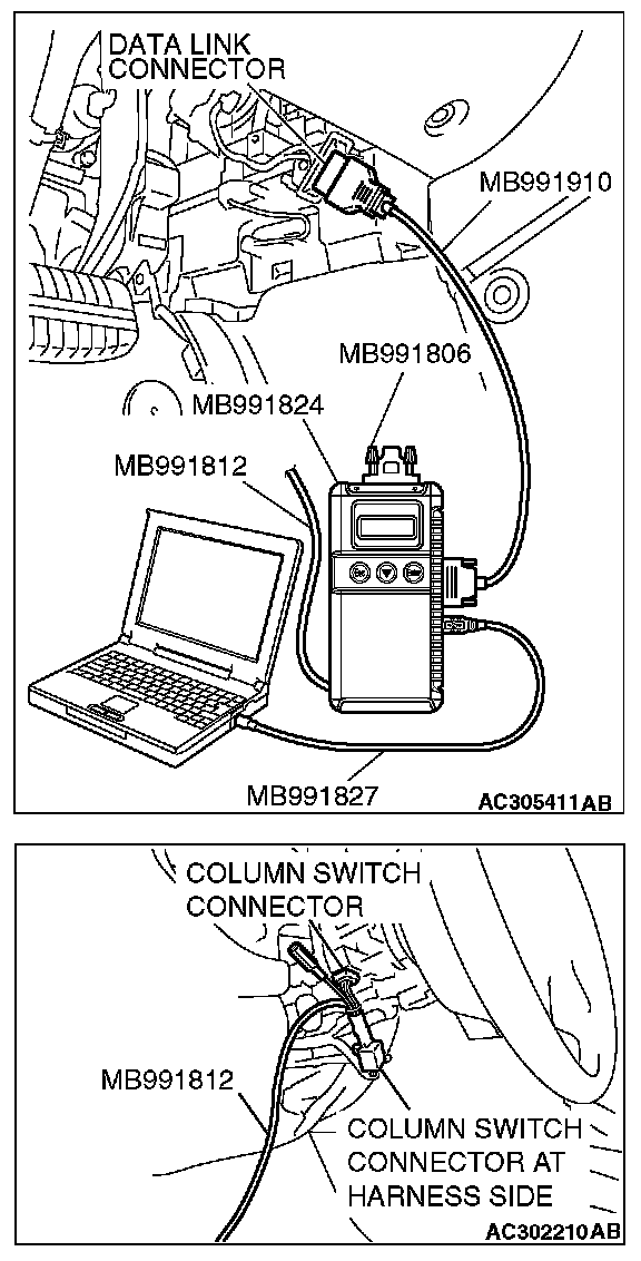 CAUTION: To prevent damage to scan tool MB991958, always turn the ignition switch to the "LOCK" (OFF) position before connecting or disconnecting scan tool MB991958. Connect special tool MB991910 before connecting special tool MB991812. Be sure to connect special tool MB991806 after turning on special tool MB991824.