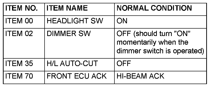 Q: Does the scan tool MB991958 display the items "HEADLIGHT SW", "DIMMER SW", "H/L AUTO-CUT" and "FRONT ECU ACK" as normal condition?