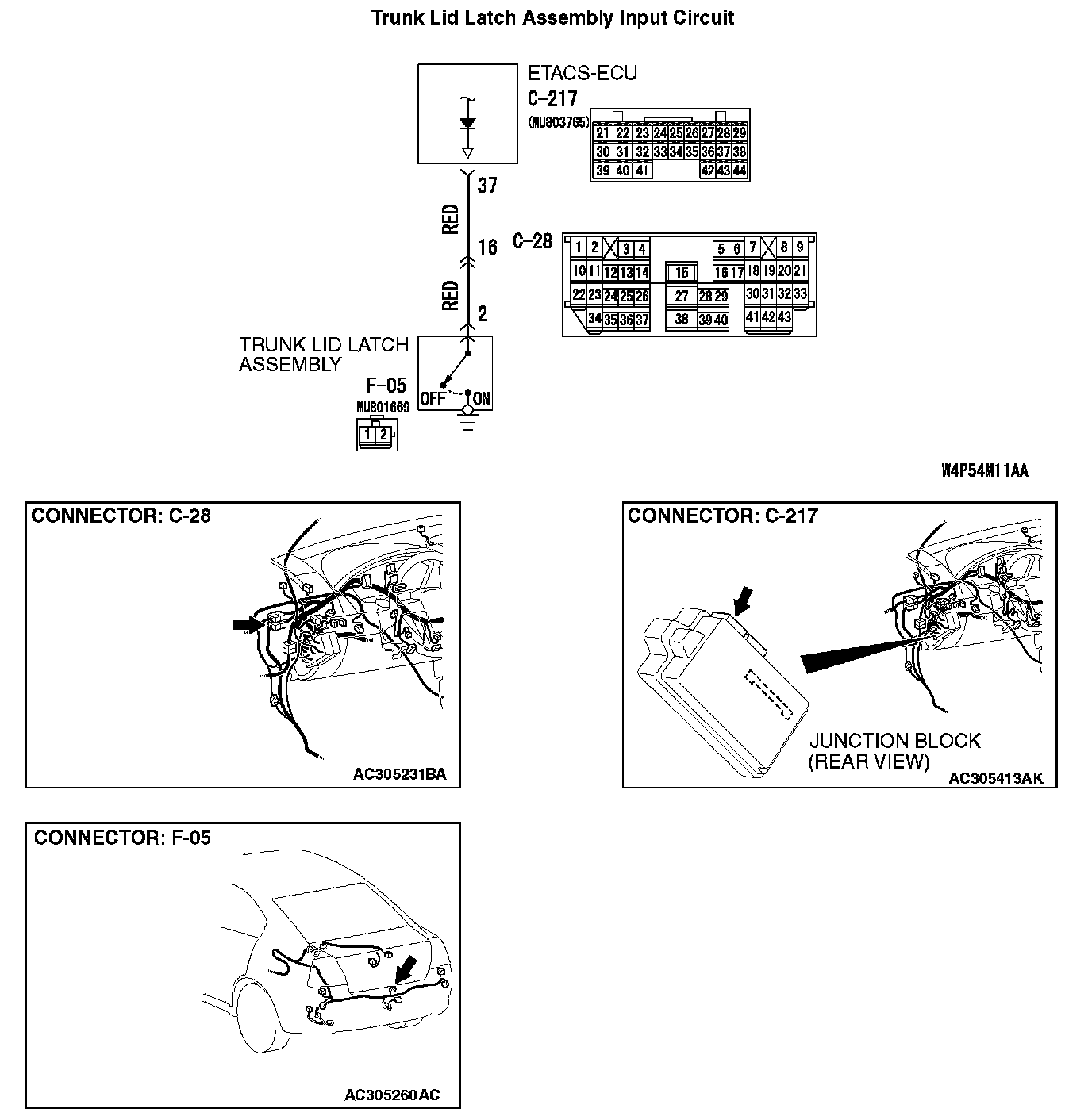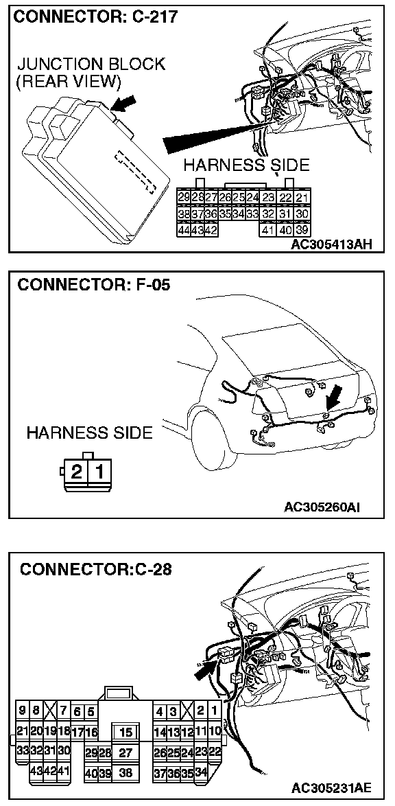 STEP 4. Check the wiring harness between trunk lid latch assembly connector F-05 (terminal 2) and ETACS-ECU connector C-217 (terminal 37).