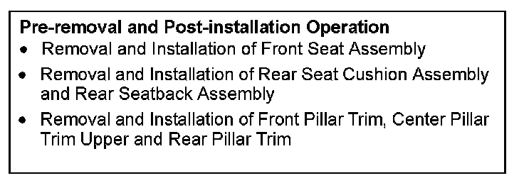 WARNING: When removing and installing the front passenger seat, be sure to carry out accuracy check occupant classification sensor after the seat has been installed in the vehicle. (Refer to SRS, On-Vehicle Service.)