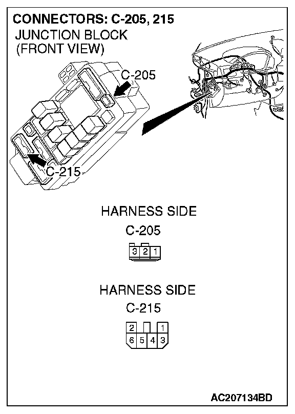 NOTE: Also check junction block connector C-205 and C-215 for loose, corroded, or damaged terminals, or terminals pushed back in the connector. If junction block connector C-205 and C-215 is damaged, repair or replace the connector as described in General (Electrical), Harness Connector Inspection.