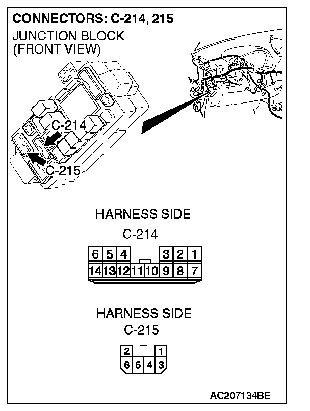 NOTE: Also check junction block connectors C-214, C-215, joint connector C-01, intermediate connector A-13 for loose, corroded, or damaged terminals, or terminals pushed back in the connector. If junction block connectors C-214, C-215, joint connector C-01, intermediate connector A-13 are damaged, Repair or replace the damaged component(s) as described in General (Electrical), Harness Connector Inspection.