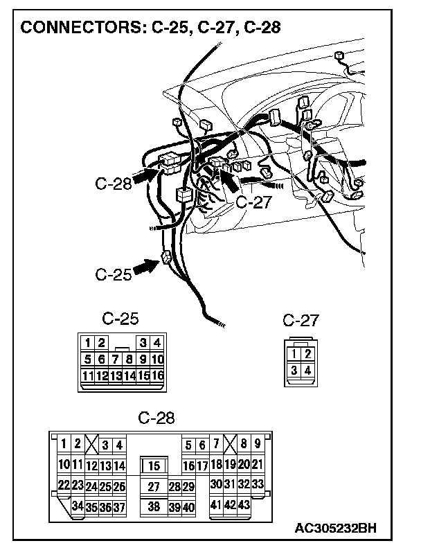 NOTE: Also check intermediate connectors C-25, C-27, C-28 and A-13 for loose, corroded, or damaged terminals, or terminals pushed back in the connector. If intermediate connectors C-25, C-27, C-28 and A-13 is damaged, repair or replace the connector as described in General (Electrical), Harness Connector Inspection.