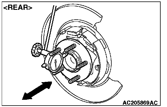 2) Remove the brake disc. Then place a dial gauge as shown, and measure the end play while moving the hub in the axial direction.