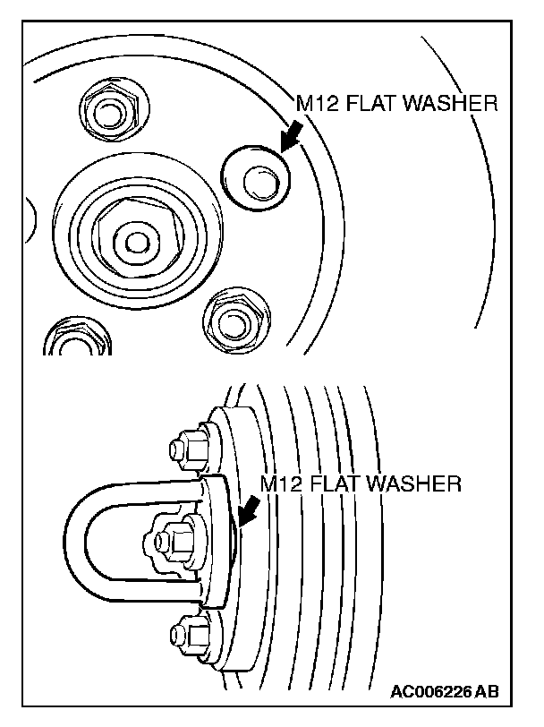 ^ When the on-the-car type lathe is used, first install a M12 flat washer on the stud bolt in the brake disc side according to the figure, and then install the adapter. If the adapter is installed with M12 flat washer not seated, the brake disc rotor may be deformed, resulting in inaccurate grinding.
