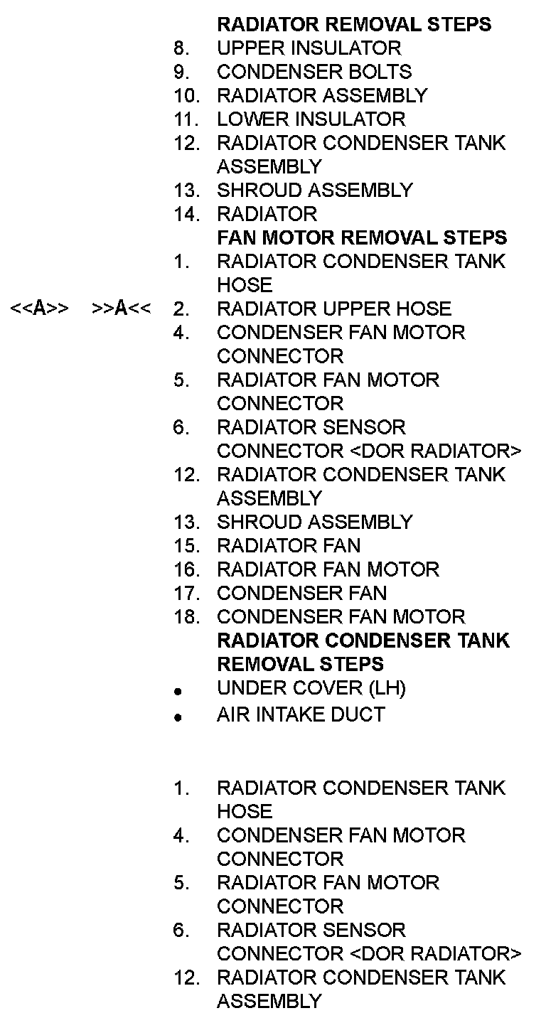 Radiator Removal Steps 8-18, Fan Motor Removal Steps 1-18, Radiator Condenser Tank Removal Steps 1-12: