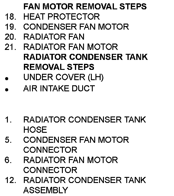 Fan Motor Removal Steps 18-21, Radiator Condenser Tank Removal Steps 1-12: