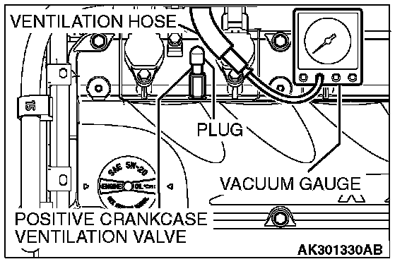 3. Disconnect the ventilation hose from the positive crankcase ventilation (PCV) valve, and then connect a vacuum gauge to the ventilation hose. Plug the PCV valve.