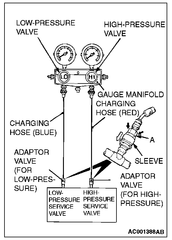 NOTE: The high-pressure service valve is on the A/C pipe and the low-pressure service valve is on the suction hose.