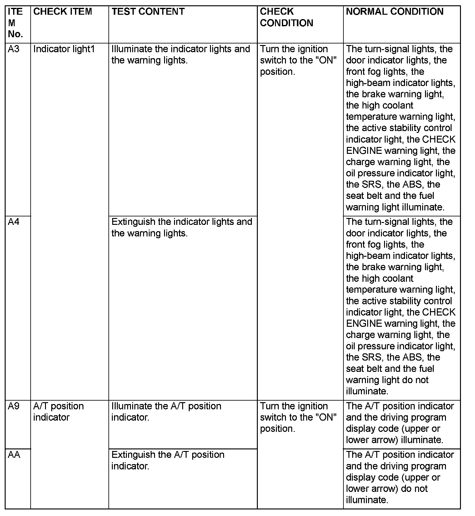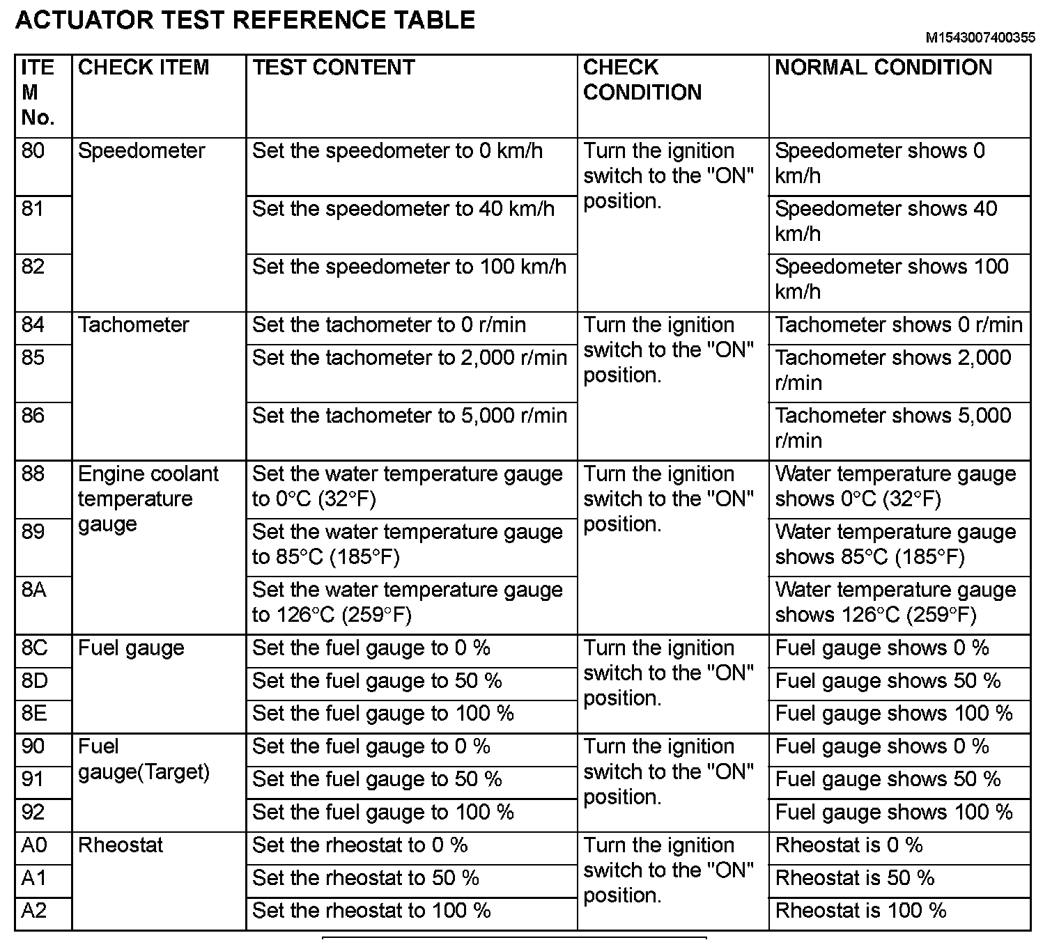 Actuator Test Reference Table
