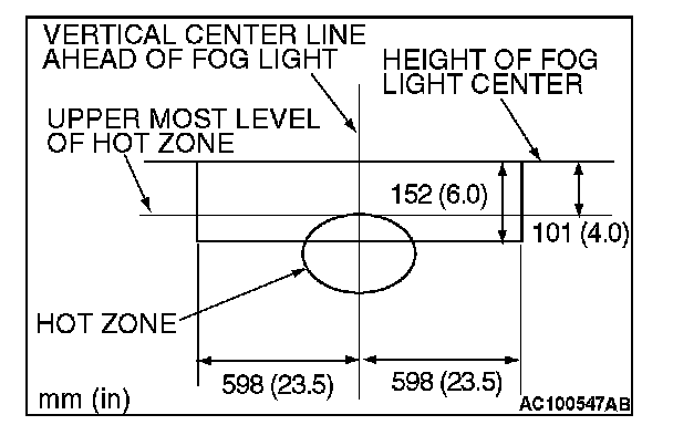 (Vertical direction): Top of the hot zone should be 152 mm (6.0 inches) (1.14 degrees angle) in maximum downward from the height of the fog light center.