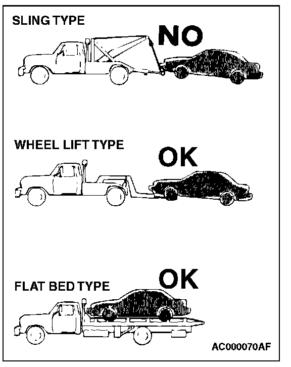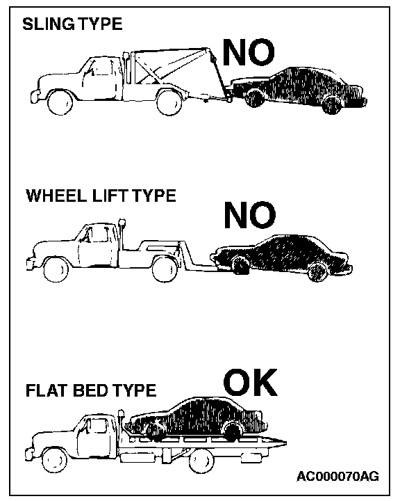 CAUTION: This vehicle cannot be towed by a wrecker using sling-type equipment; otherwise the bumper may become deformed. If this vehicle is towed, use wheel lift or flat bed equipment.