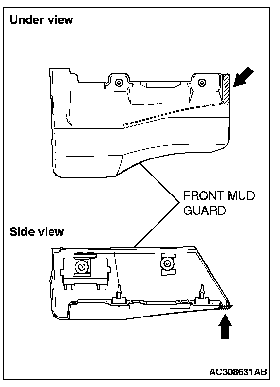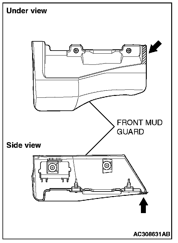 ^ If the assembling support area contacts with the front mud guard (arrow area as shown in the illustration), the front mud guard will be damaged. Slide the assembling support area to the front of the vehicle slightly to prevent the damage.