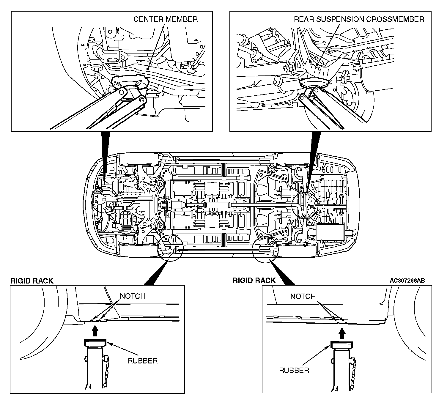 ^ For lifting, put rubber or similar material between the side sill and rigid rack, otherwise the side sill area will be damaged.