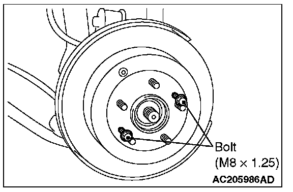 If the brake disc is seized, install M8 x 1.25 bolts as shown, and remove the disc by tightening the bolts evenly and gradually.